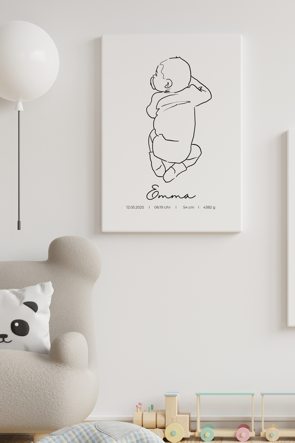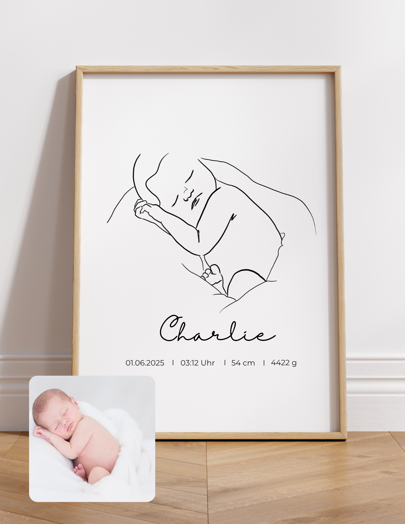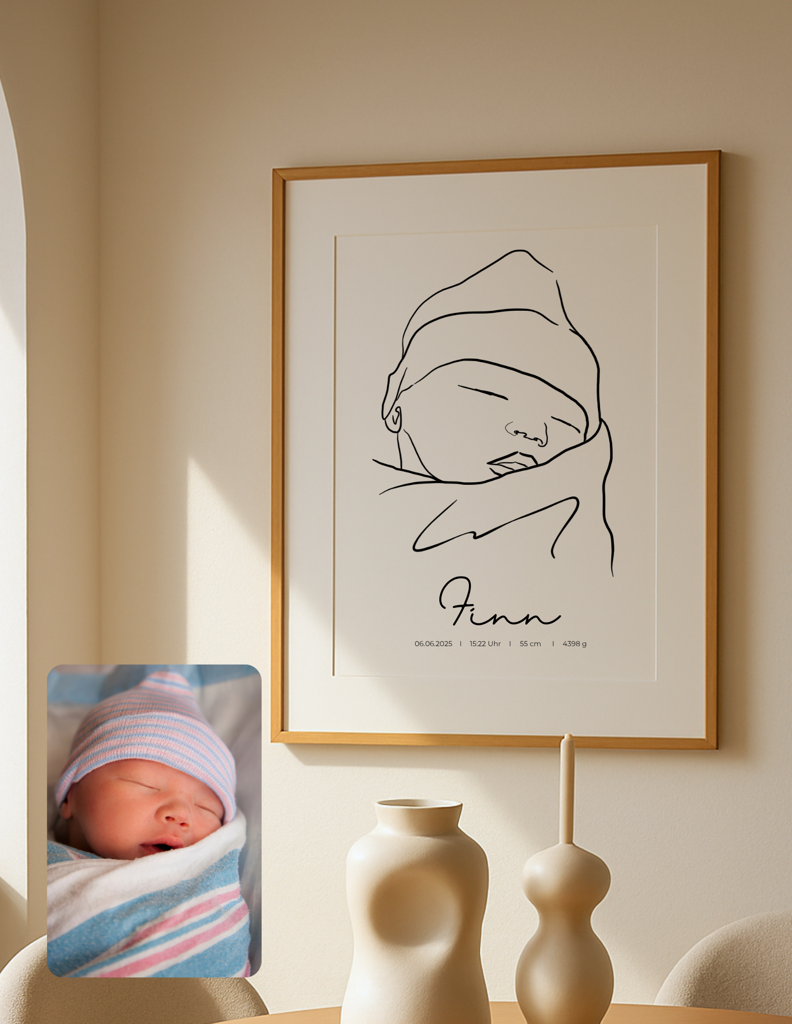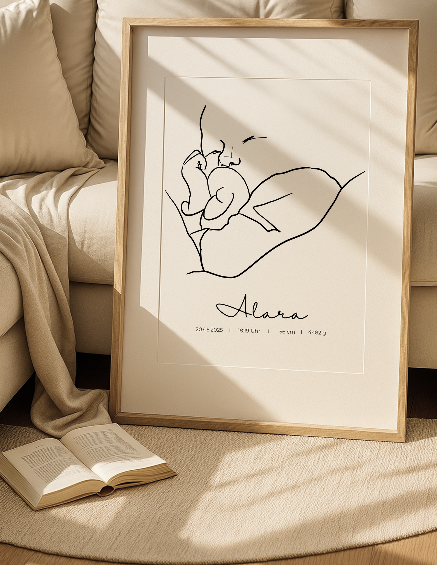Eine Liebe, die mit dem ersten Atemzug beginnt. Wir verwandeln euer erstes gemeinsames Foto in ein handgezeichnetes Line Art Poster – personalisiert mit Name, Geburtsdatum, Uhrzeit und Gewicht. Ein besonderes Geschenk.