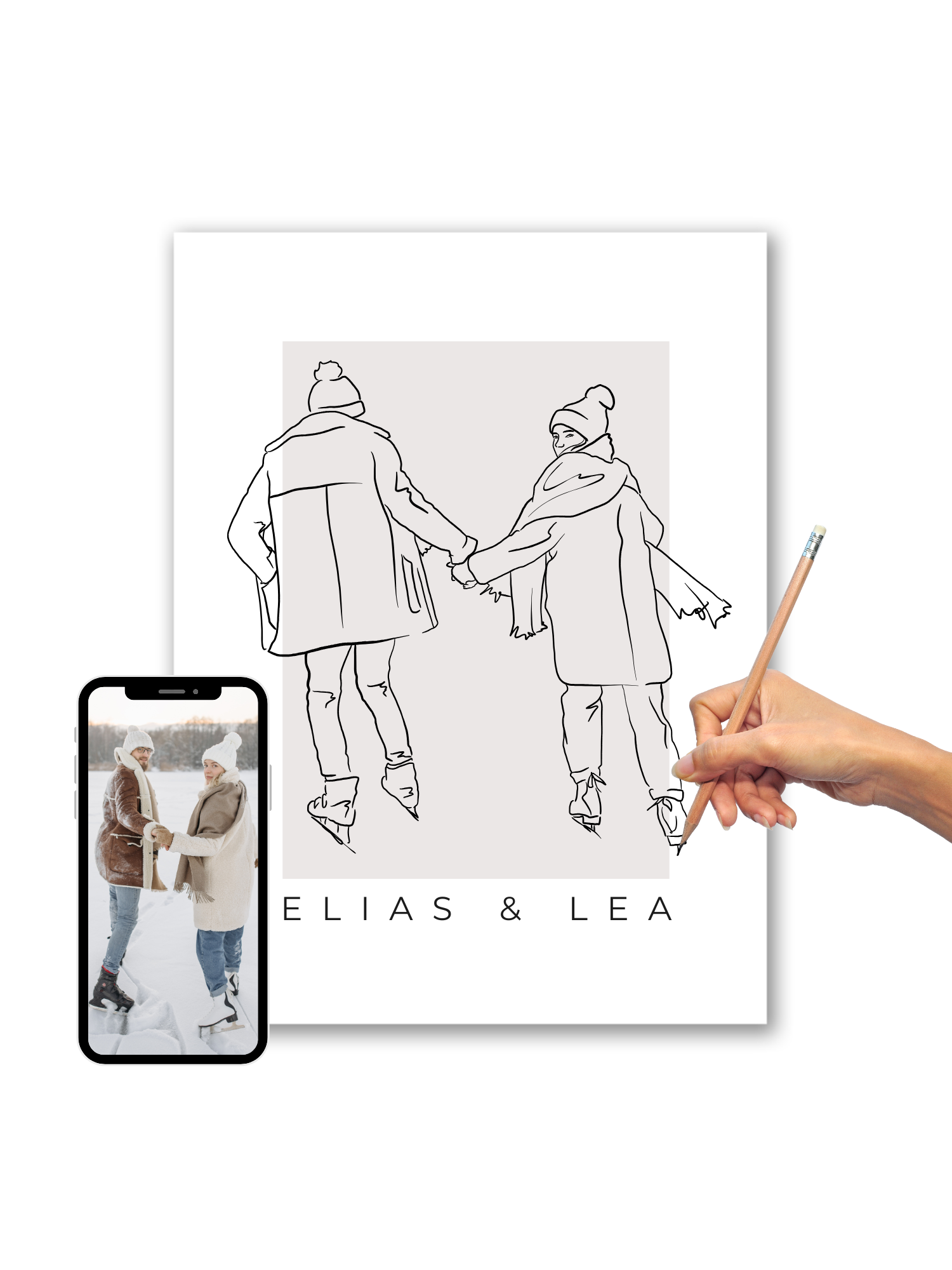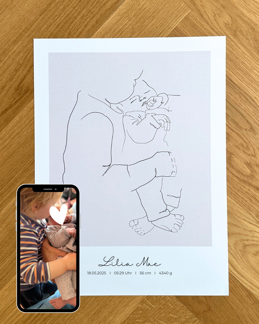 Jedes Line Art Poster wird von der Künstlerin Selin handgezeichnet und in ihrem individuellen Stil umgesetzt. Dein Foto dient dabei als Vorlage, die in eine minimalistische und elegante Zeichnung verwandelt wird.