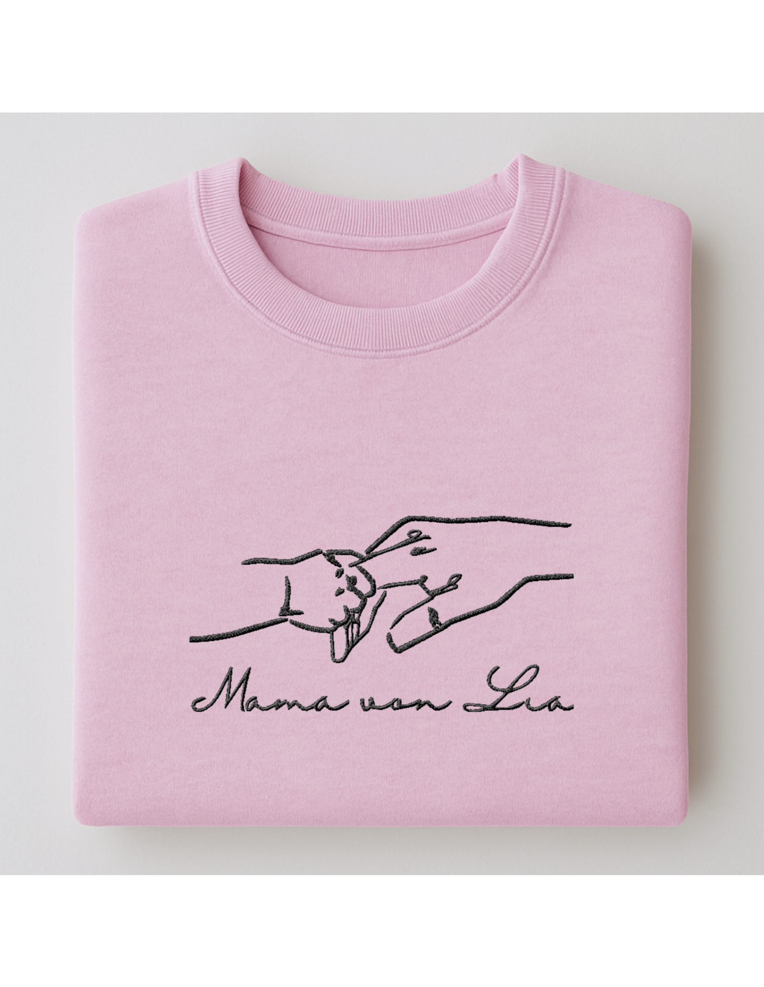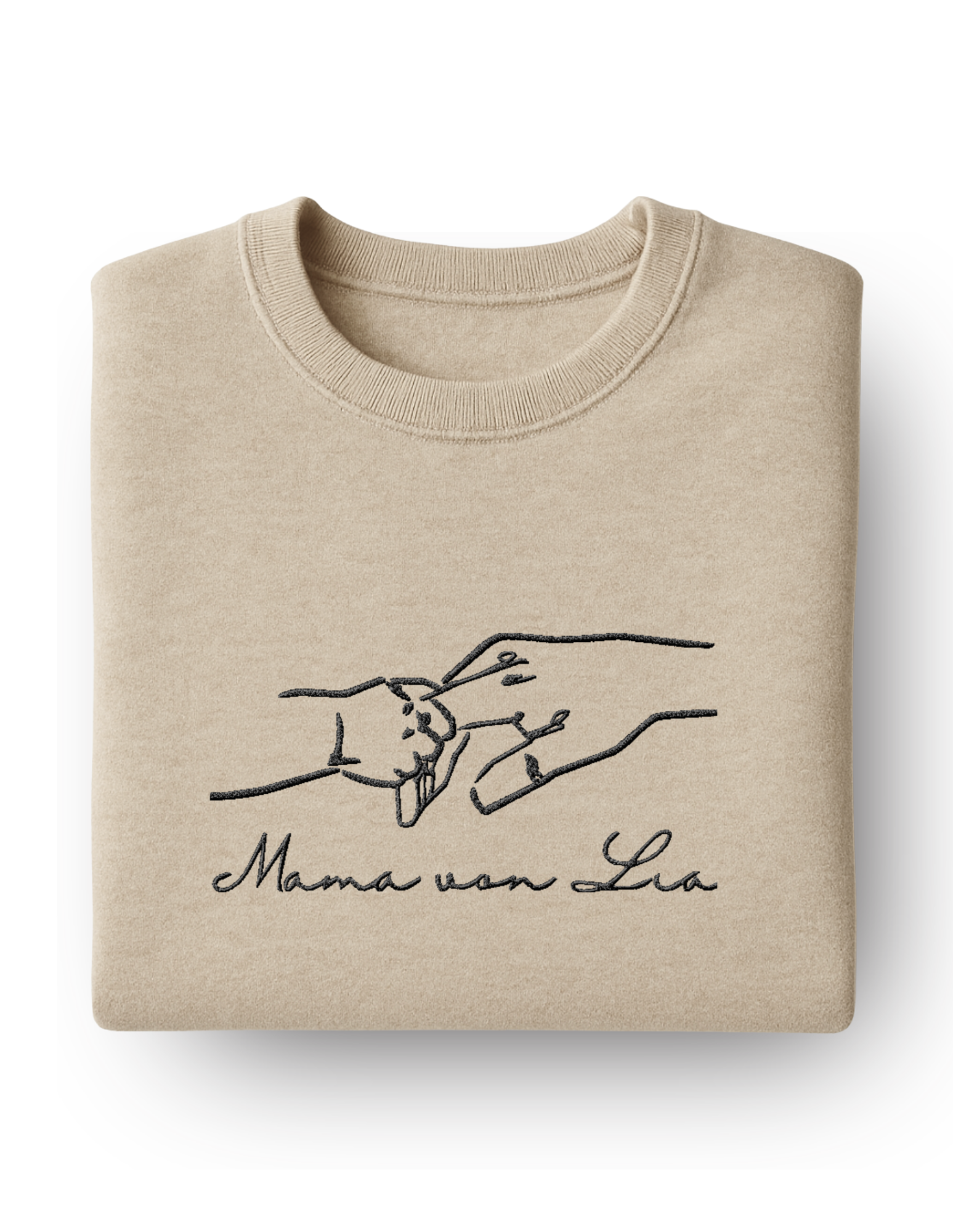 Jeder Pullover wird individuell bestickt mit deinem Wunschtext. Zum Beispiel: „Mama von Emma“, „Oma von Leon“ oder „Bester Papa der Welt“. So entsteht ein einzigartiges Andenken an die erste Zeit mit dem Baby.